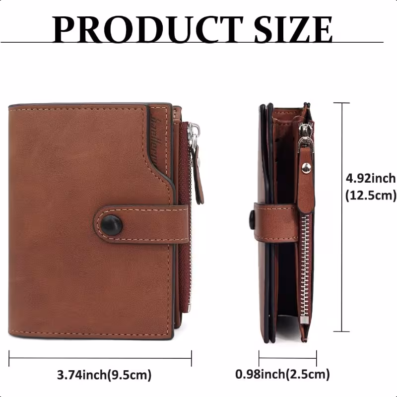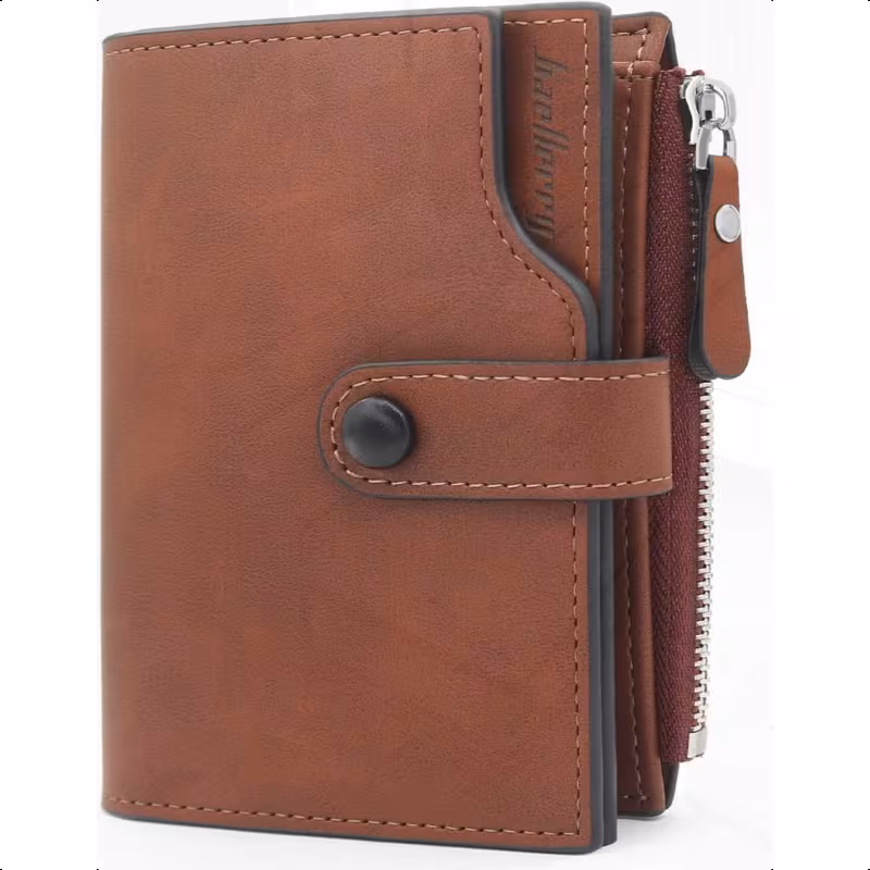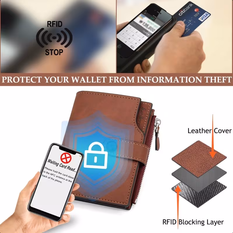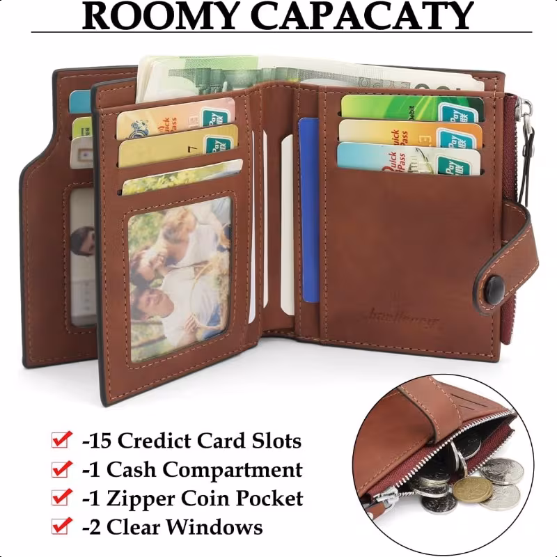 超薄設計のRFID防止メンズ二つ折り財布。15枚のカードスロット、現金ポケット、IDウィンドウを備え、日常からフォーマルまで幅広く使用可能。